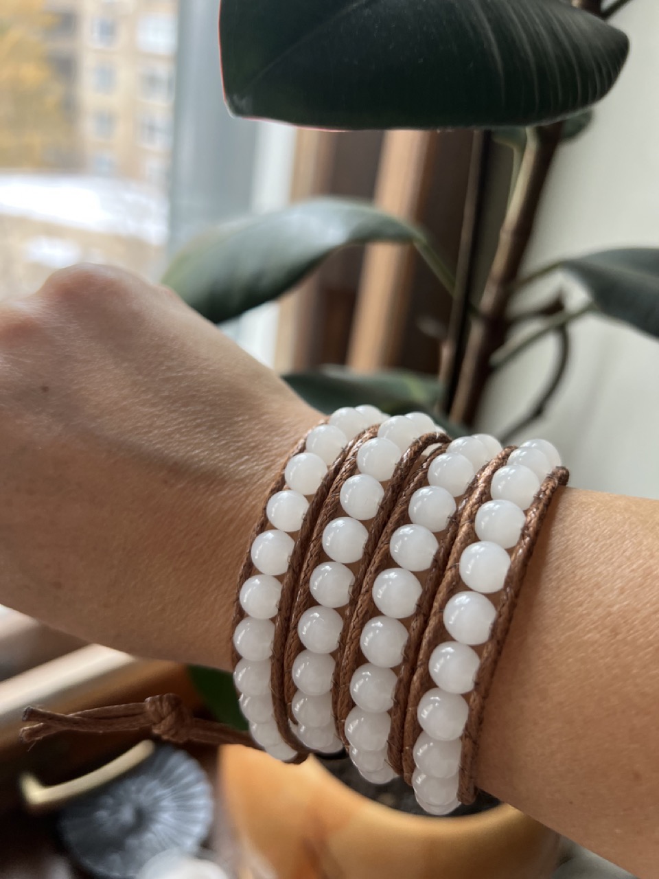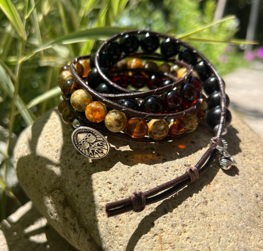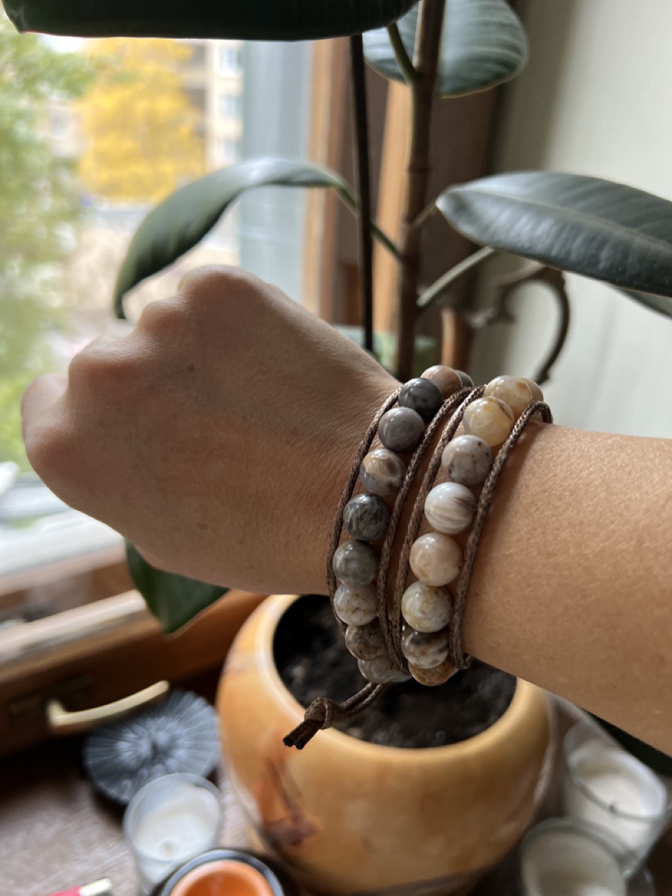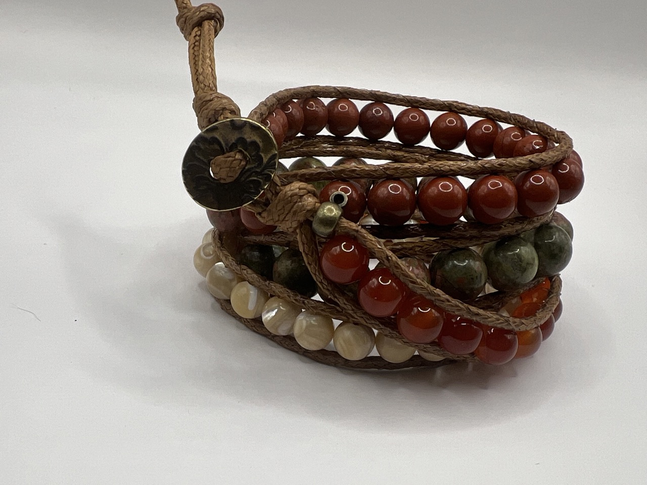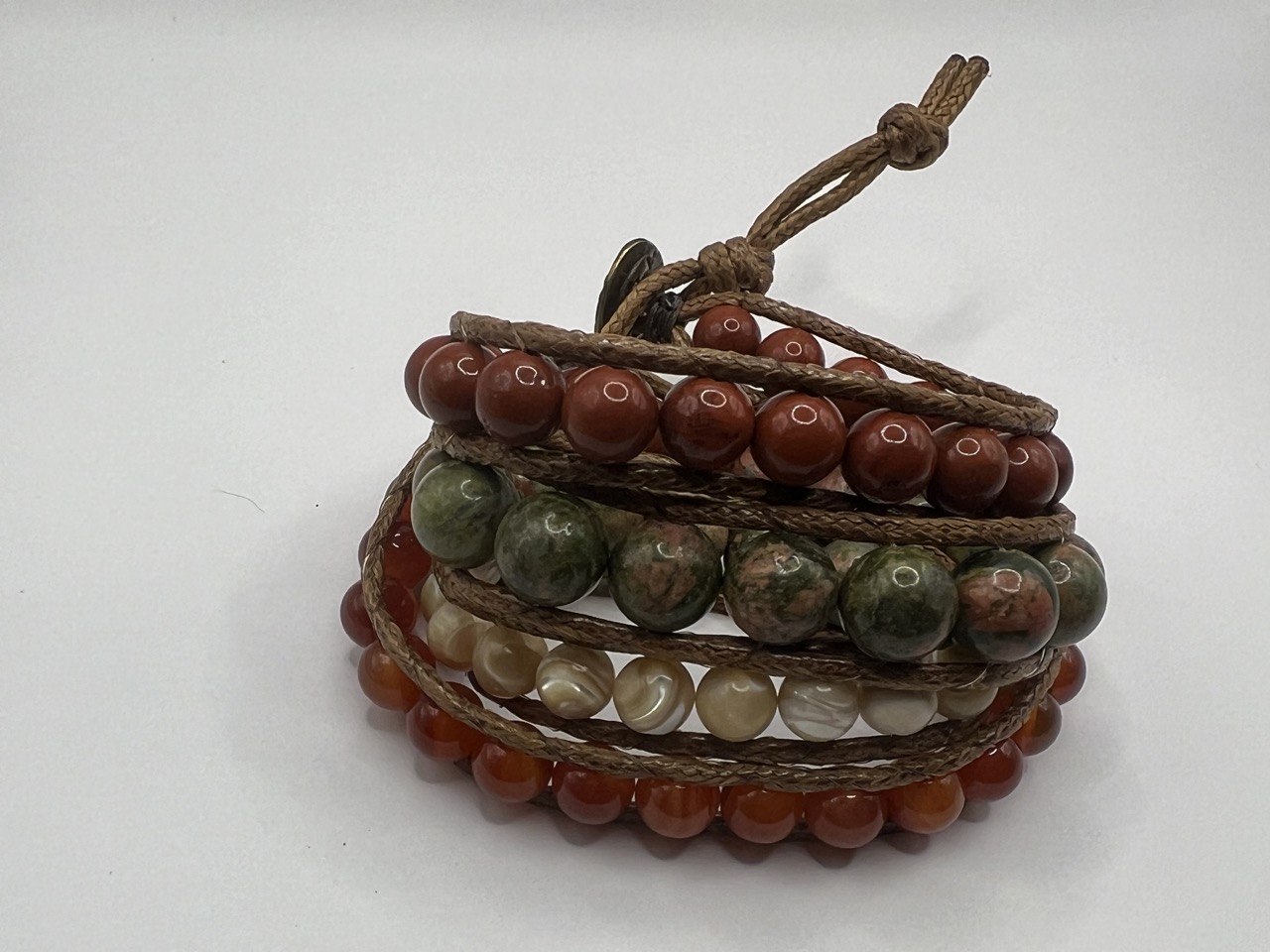 Красные и терракотовые камни пробуждают внутренний огонь, зелёно-коричневые придают заземлённость, а светлый перламутр — как оазис ясности в сердце движения.
