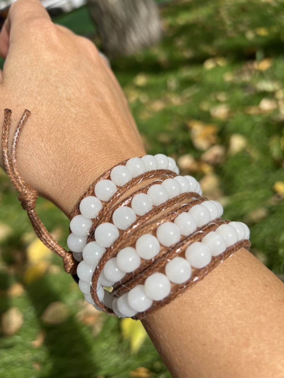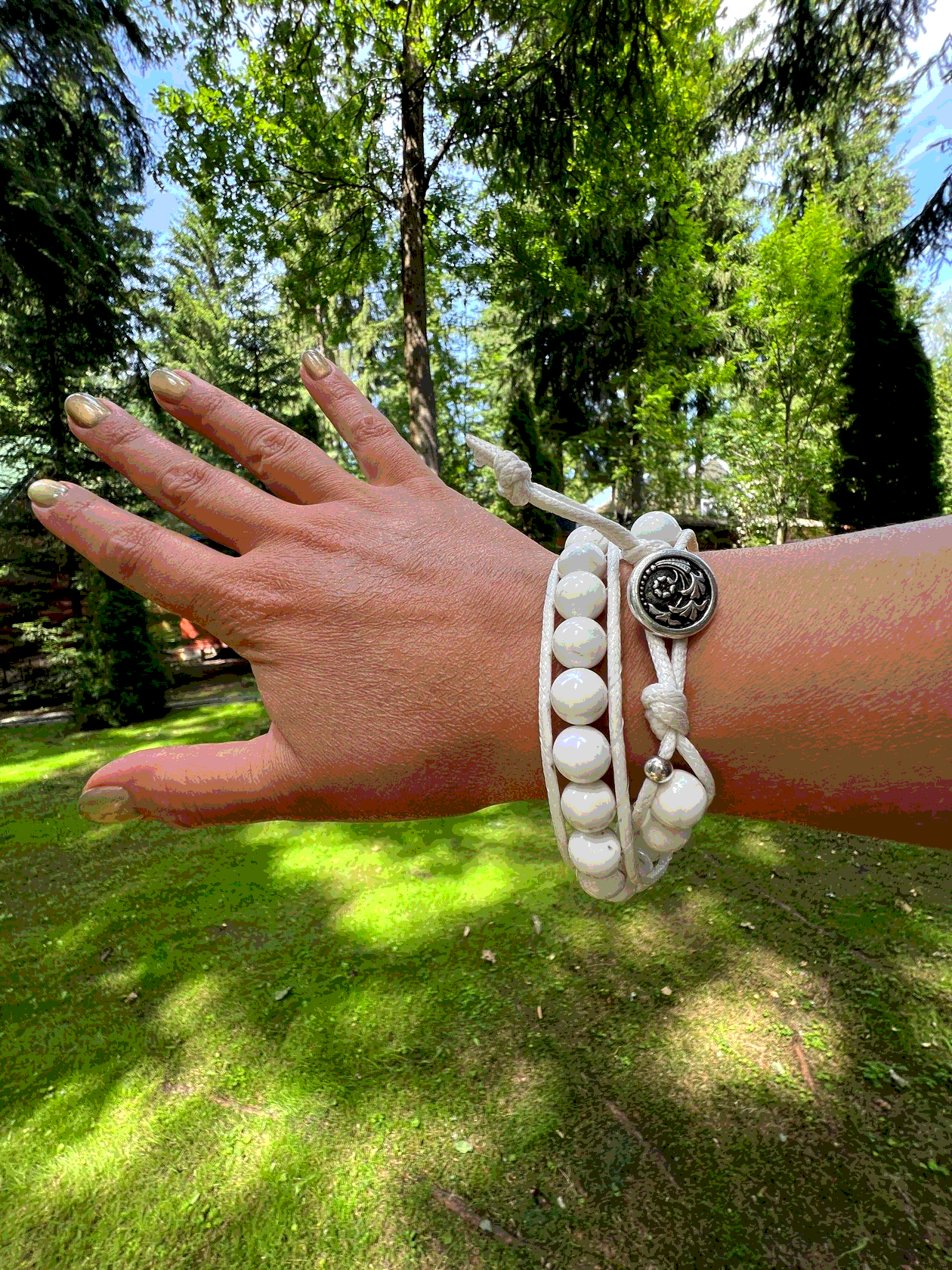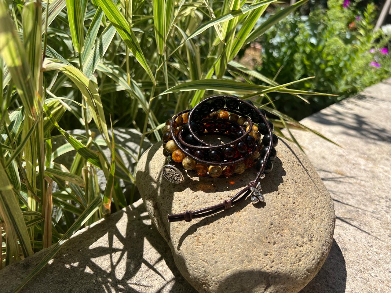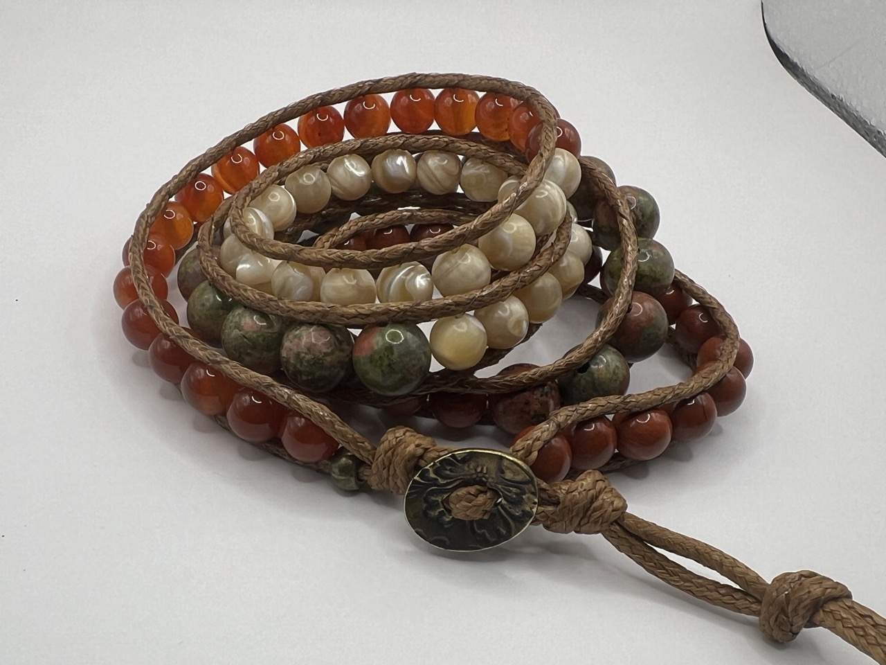 Красные и терракотовые камни пробуждают внутренний огонь, зелёно-коричневые придают заземлённость, а светлый перламутр — как оазис ясности в сердце движения.